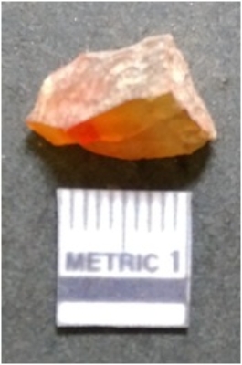 | Description / विवरण | It is carnelian flake red in color, with sharp flakes edges and a small bulb of percussion owing to knapping activity. The piece has sharp flaked edges and a crypto-crystalline matrix. |