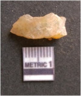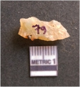 | Description / विवरण | It is chalcedony flake, translucent in appearance. The piece shows sharp pointed ends and flake scars on the surface as a result of flaking. The piece shows a bulb of percussion. |