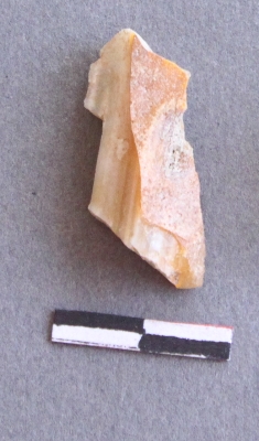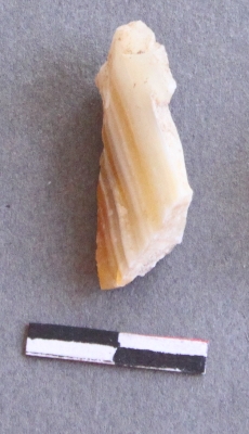 | Description / विवरण | It is a chalcedony fragment, with a bulb of percussion on the ventral side. Cortex on one end. |