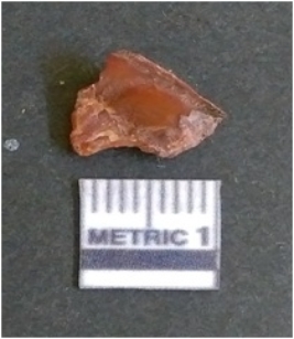 | Description / विवरण | The chert piece is dark in color, with a prominent bulb of percussion and sharp flaked edges. The piece is a part of lithic debitage or raw material for lithic knapping. The piece shows clear ripple marks and bulb of percussion. |