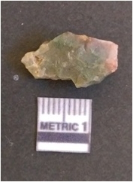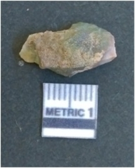 | Description / विवरण | The chert piece is dark in color, with a prominent bulb of percussion and sharp flaked edges. The piece is a part of lithic debitage or raw material for lithic knapping. The piece shows clear ripple marks and bulb of percussion. |