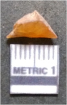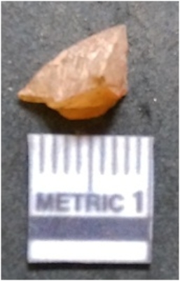| Description / विवरण | The chert piece is pale orange in color, with a prominent bulb of percussion and sharp flaked edges. The piece is a part of lithic debitage or raw material for lithic knapping. The piece shows clear ripple marks and bulb of percussion. |