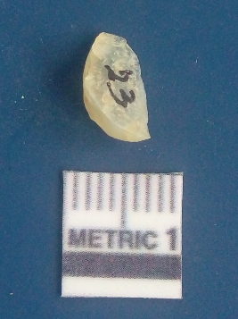 | Description / विवरण | It is chalcedony flake, translucent in appearance. The piece shows sharp pointed ends and flake scars on the surface as a result of flaking. The piece shows a bulb of percussion. |