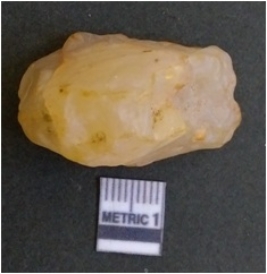 | Description / विवरण | The quartz flake has sharp flaked edges and pointed ends as a result of flaking. The piece is semi-transparent in nature with irregular fracture pattern. The piece is roughly triangular in shape and has a prominent bulb of percussion. |