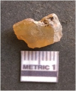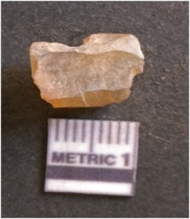 | Description / विवरण | It is chalcedony flake, translucent in appearance. The piece shows sharp pointed ends and flake scars on the surface as a result of flaking. The piece shows a bulb of percussion. |