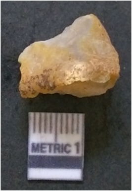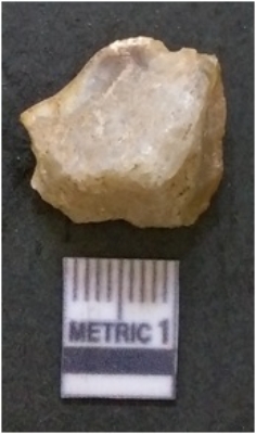 | Description / विवरण | The quartz flake has sharp flaked edges and pointed ends as a result of flaking. The piece is semi-transparent in nature with irregular fracture pattern. The piece is roughly triangular in shape and has a prominent bulb of percussion. |