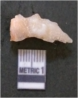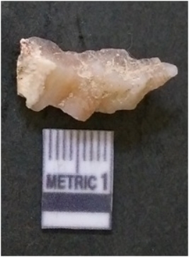 | Description / विवरण | The quartz flake has sharp flaked edges and pointed ends as a result of flaking. The piece is semi-transparent in nature with irregular fracture pattern. The piece is roughly triangular in shape and has a prominent bulb of percussion. |