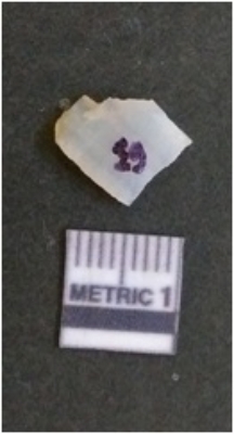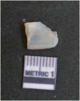 | Description / विवरण | The banded agate piece is crystalline in nature, with a smooth fracture pattern and visible bands on the flaked sides. The piece is pale in color and has sharp flaked ends. |