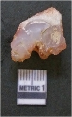 | Description / विवरण | The quartz flake has sharp flaked edges and pointed ends as a result of flaking. The piece is semi-transparent in nature with irregular fracture pattern. The piece is roughly triangular in shape and has a prominent bulb of percussion. |