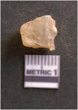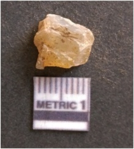 | Description / विवरण | It is chalcedony flake, translucent in appearance. The piece shows sharp pointed ends and flake scars on the surface as a result of flaking. The piece shows a bulb of percussion. |