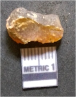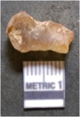 | Description / विवरण | The chert piece is dark in color, with a prominent bulb of percussion and sharp flaked edges. The piece is a part of lithic debitage or raw material for lithic knapping. The piece shows clear ripple marks and bulb of percussion. |