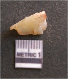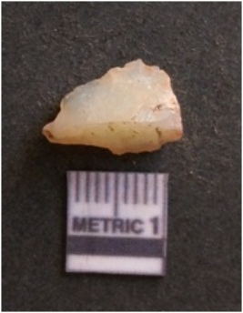 | Description / विवरण | It is chalcedony flake, translucent in appearance. The piece shows sharp pointed ends and flake scars on the surface as a result of flaking. The piece shows a bulb of percussion. |
