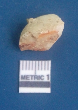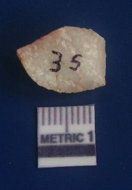 | Description / विवरण | The quartz flake has sharp flaked edges and pointed ends as a result of flaking. The piece is semi-transparent in nature with irregular fracture pattern. The piece is roughly triangular in shape and has a prominent bulb of percussion. |