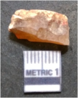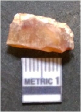 | Description / विवरण | The chert piece is dark in color, with a prominent bulb of percussion and sharp flaked edges. The piece is a part of lithic debitage or raw material for lithic knapping. The piece shows clear ripple marks and bulb of percussion. |