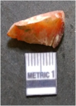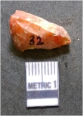 | Description / विवरण | The chert piece is dark in color, with a prominent bulb of percussion and sharp flaked edges. The piece is a part of lithic debitage or raw material for lithic knapping. The piece shows clear ripple marks and bulb of percussion. |