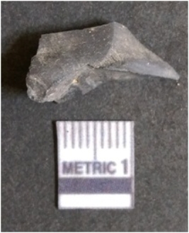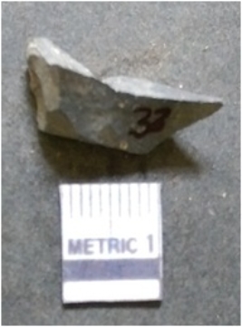 | Description / विवरण | The chert piece is dark in color, with a prominent bulb of percussion and sharp flaked edges. The piece is a part of lithic debitage or raw material for lithic knapping. The piece shows clear ripple marks and bulb of percussion. |