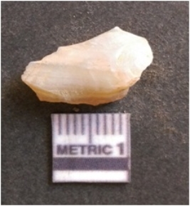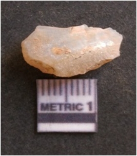 | Description / विवरण | It is chalcedony flake, translucent in appearance. The piece shows sharp pointed ends and flake scars on the surface as a result of flaking. The piece shows a bulb of percussion. |