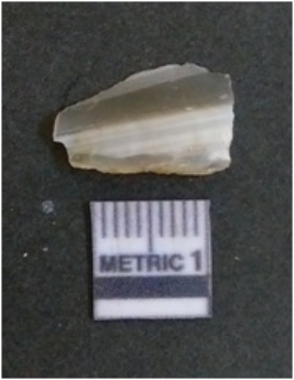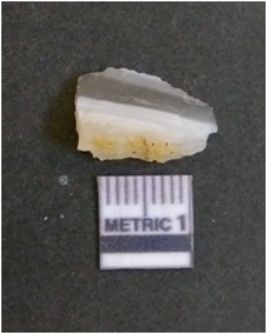 | Description / विवरण | The banded agate piece is crystalline in nature, with a smooth fracture pattern and visible bands on the flaked sides. The piece is pale in color and has sharp flaked ends. |