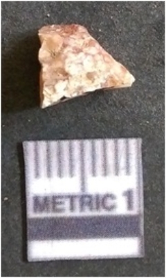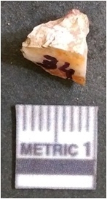 | Description / विवरण | The quartz flake has sharp flaked edges and pointed ends as a result of flaking. The piece is semi-transparent in nature with irregular fracture pattern. The piece is roughly triangular in shape and has a prominent bulb of percussion. |