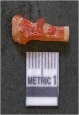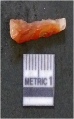 | Description / विवरण | It is carnelian flake red in color, with sharp flakes edges and a small bulb of percussion owing to knapping activity. The piece has sharp flaked edges and a crypto-crystalline matrix. |