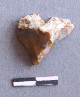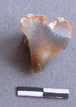 | Description / विवरण | It is a chalcedony fragment, with a striking platform, cortex on one end; there are many flake scars with ripples on it. |