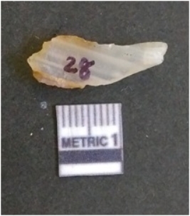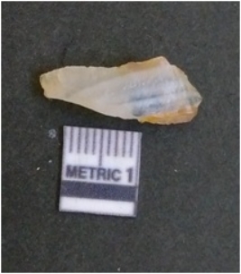 | Description / विवरण | The banded agate piece is crystalline in nature, with a smooth fracture pattern and visible bands on the flaked sides. The piece is pale in color and has sharp flaked ends. |
