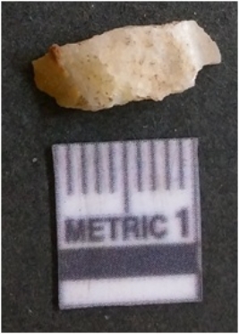 | Description / विवरण | The quartz flake has sharp flaked edges and pointed ends as a result of flaking. The piece is semi-transparent in nature with irregular fracture pattern. The piece is roughly triangular in shape and has a prominent bulb of percussion. |