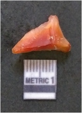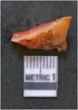 | Description / विवरण | It is carnelian flake red in color, with sharp flakes edges and a small bulb of percussion owing to knapping activity. The piece has sharp flaked edges and a crypto-crystalline matrix. |