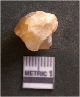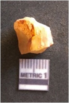 | Description / विवरण | It is chalcedony flake, translucent in appearance. The piece shows sharp pointed ends and flake scars on the surface as a result of flaking. The piece shows a bulb of percussion. |