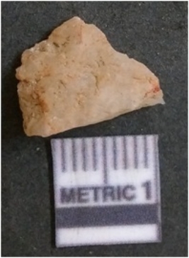 | Description / विवरण | The quartz flake has sharp flaked edges and pointed ends as a result of flaking. The piece is semi-transparent in nature with irregular fracture pattern. The piece is roughly triangular in shape and has a prominent bulb of percussion. |