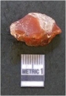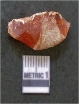| Description / विवरण | It is carnelian flake red in color, with sharp flakes edges and a small bulb of percussion owing to knapping activity. The piece has sharp flaked edges and a crypto-crystalline matrix. |