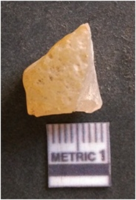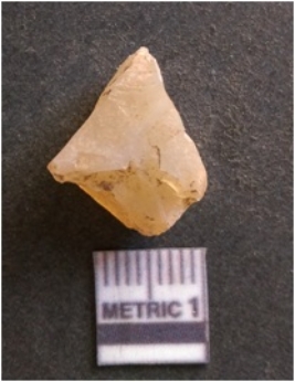 | Description / विवरण | It is chalcedony flake, translucent in appearance. The piece shows sharp pointed ends and flake scars on the surface as a result of flaking. The piece shows a bulb of percussion. |