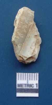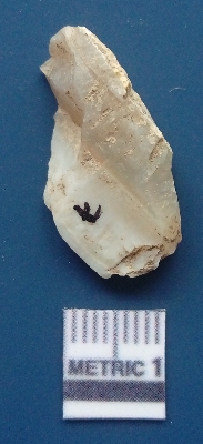 | Description / विवरण | It is chalcedony flake, translucent in appearance. The piece shows sharp pointed ends and flake scars on the surface as a result of flaking. The piece shows a bulb of percussion. |