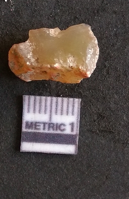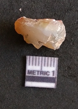 | Description / विवरण | The quartz fragment shows prominent flaks scars and sharp flaked ends as a result of flaking. The piece is translucent white and shows cryptocrystalline matrix. |