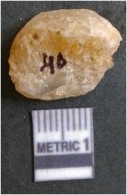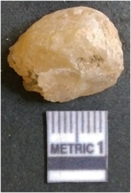 | Description / विवरण | The quartz flake has sharp flaked edges and pointed ends as a result of flaking. The piece is semi-transparent in nature with irregular fracture pattern. The piece is roughly triangular in shape and has a prominent bulb of percussion. |