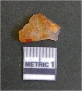 | Description / विवरण | It is carnelian flake red in color, with sharp flakes edges and a small bulb of percussion owing to knapping activity. The piece has sharp flaked edges and a crypto-crystalline matrix. |