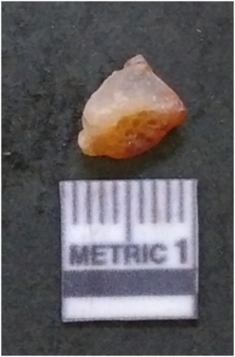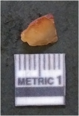| Description / विवरण | It is chalcedony flake, translucent in appearance. The piece shows sharp pointed ends and flake scars on the surface as a result of flaking. The piece shows a bulb of percussion. |