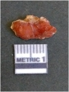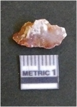 | Description / विवरण | It is carnelian flake red in color, with sharp flakes edges and a small bulb of percussion owing to knapping activity. The piece has sharp flaked edges and a crypto-crystalline matrix. |
