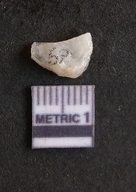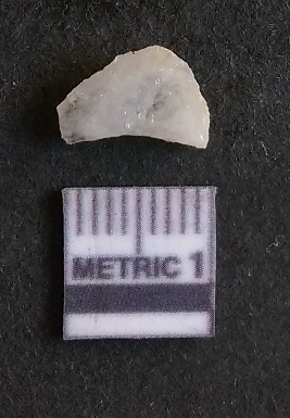| Description / विवरण | The quartz fragment shows prominent flaks scars and sharp flaked ends as a result of flaking. The piece is translucent white and shows cryptocrystalline matrix. |
