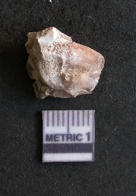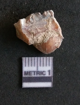 | Description / विवरण | The chert piece is dark in color, with a prominent bulb of percussion and sharp flaked edges. The piece is a part of lithic debitage or raw material for lithic knapping. |
