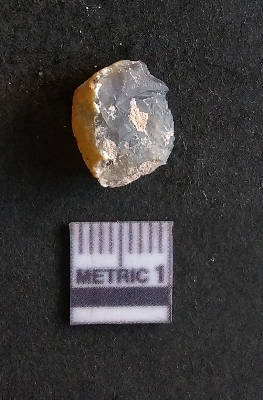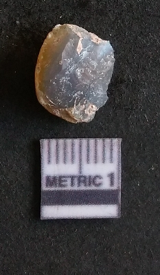 | Description / विवरण | The chert piece is dark in color, with a prominent bulb of percussion and sharp flaked edges. The piece is a part of lithic debitage or raw material for lithic knapping. |