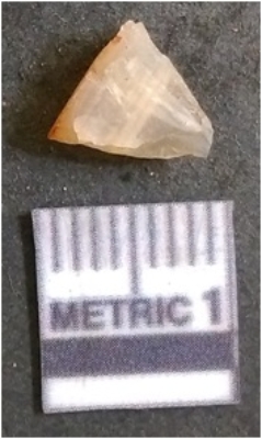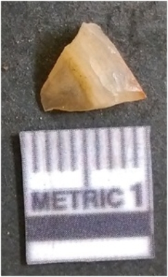 | Description / विवरण | It is chalcedony flake, translucent in appearance. The piece shows sharp pointed ends and flake scars on the surface as a result of flaking. The piece shows a bulb of percussion. |