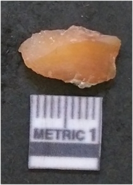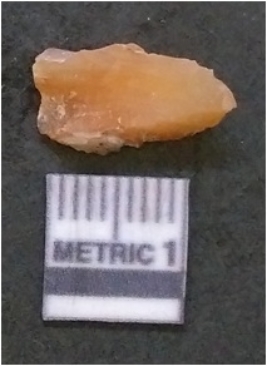 | Description / विवरण | It is chalcedony flake, translucent in appearance. The piece shows sharp pointed ends and flake scars on the surface as a result of flaking. The piece shows a bulb of percussion. |