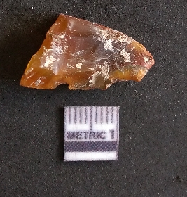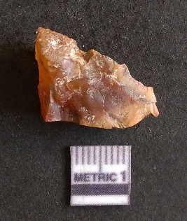 | Description / विवरण | The agate piece is translucent in appurtenance, with angular flaked edges and a bulb of percussion. The piece shows flake scars on the surface. |
