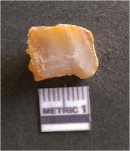 | Description / विवरण | It is chalcedony flake, translucent in appearance. The piece shows sharp pointed ends and flake scars on the surface as a result of flaking. The piece shows a bulb of percussion. |