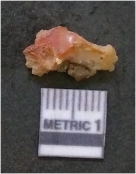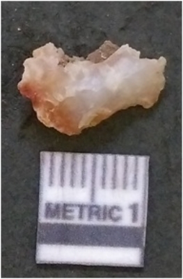 | Description / विवरण | It is chalcedony flake, translucent in appearance. The piece shows sharp pointed ends and flake scars on the surface as a result of flaking. The piece shows a bulb of percussion. |