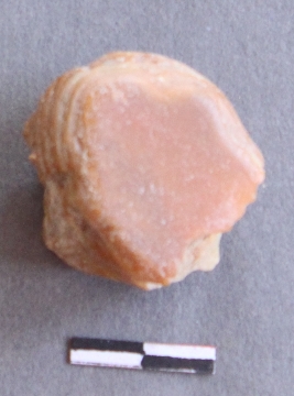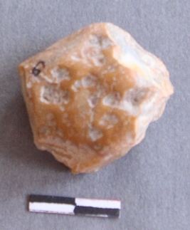 | Description / विवरण | The chalcedony piece has rounded edges and a flat side as a result of flaking. |