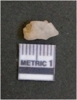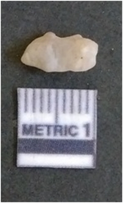 | Description / विवरण | The quartz flake has sharp flaked edges and pointed ends as a result of flaking. The piece is semi-transparent in nature with irregular fracture pattern. The piece is roughly triangular in shape and has a prominent bulb of percussion. |