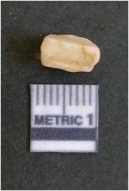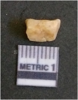 | Description / विवरण | The quartz flake has sharp flaked edges and pointed ends as a result of flaking. The piece is semi-transparent in nature with irregular fracture pattern. The piece is roughly triangular in shape and has a prominent bulb of percussion. |