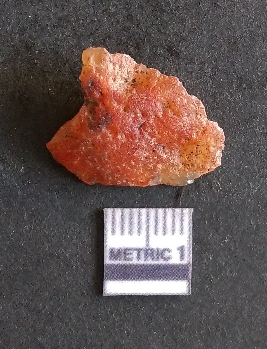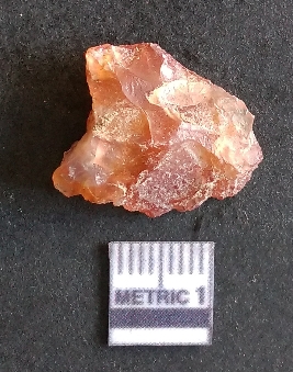 | Description / विवरण | The carnelian flake is reddish in color, with sharp flakes edges and a small bulb of percussion owing to knapping activity. |